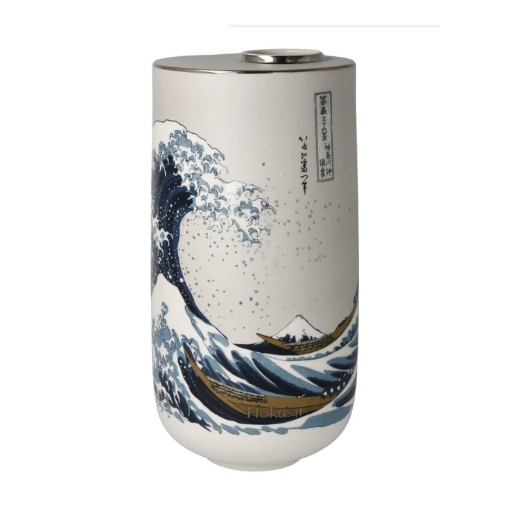 Decorative discs of porcelain seem to be freely floating on a wooden base. Designer objects add a fabulous appearance to the depicted famous paintings by Hokusai. The disc-shaped vases are beautiful eye-catchers in any living ambiance and can be decorated with or without flower arrangements!
