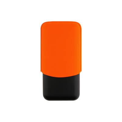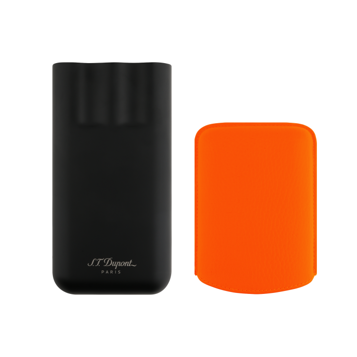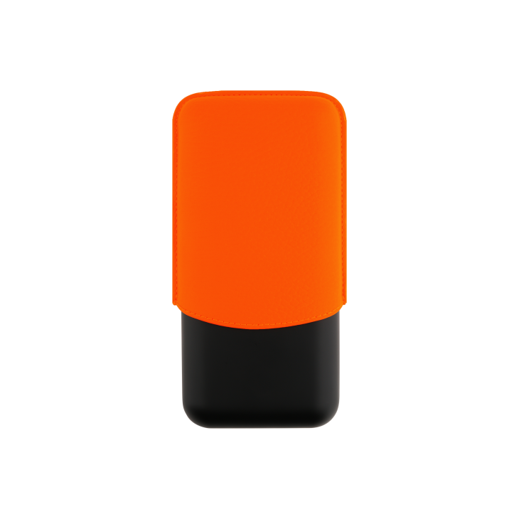 Etui 3 cigares en cuir de veau grainé orange fluo et base métal noire mate.