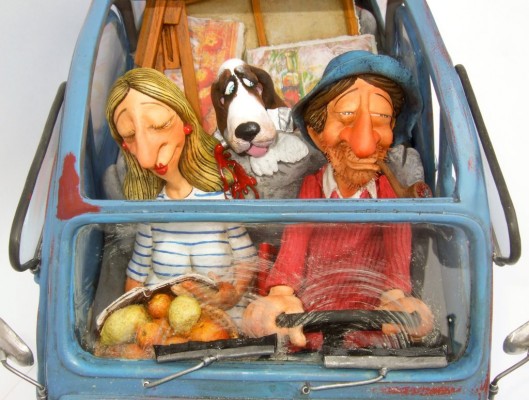 Sur la banquette arrière, Aramis, le chien, débordant d’enthousiasme, sautait au milieu des tubes de peinture, libérant leurs couleurs dans un joyeux « happening » improvisé.