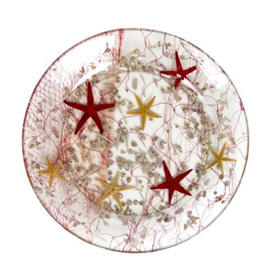 Les étoiles de mer rouges se mêlent aux coquillages et aux algues fines, figés dans la transparence de la résine comme dans un éclat d’ambre marin. Une composition qui capture l’essence de la Méditerranée, rappelant les paysages lumineux et les fonds marins de la Côte d’Azur.