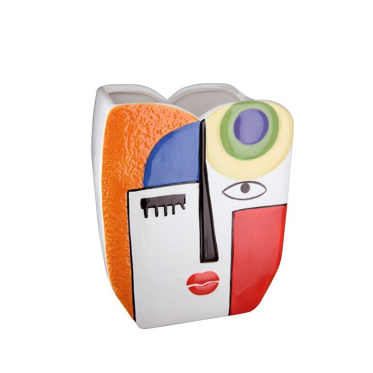 Vase en céramique multicolore au motif de visage abstrait, inspiré du style cubiste.